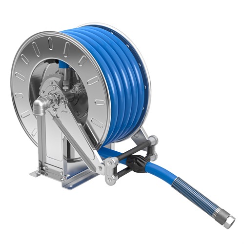 Automatisk slangupprullare avsedd för tvättoperationer med vatten och diskmedel vid olika tryck- och temperaturförhållanden.