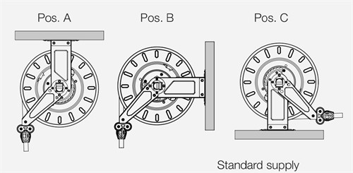 Slangstyrarmarna är justerbara i tre olika lägen enligt till slangupprullningsinstallationen (pos. A-B-C).