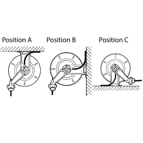 Slangstyrarmarna är justerbara i tre olika lägen enligt till slangupprullningsinstallationen (pos. A-B-C).