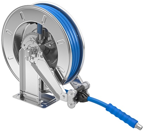 Automatisk slangupprullare avsedd för tvättoperationer med vatten och diskmedel vid olika tryck- och temperaturförhållanden.
