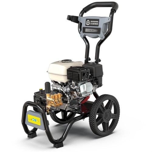 Högtryckstvätt utrustad med tvåhjulig vagn, handtag och antivibrationsfötter.