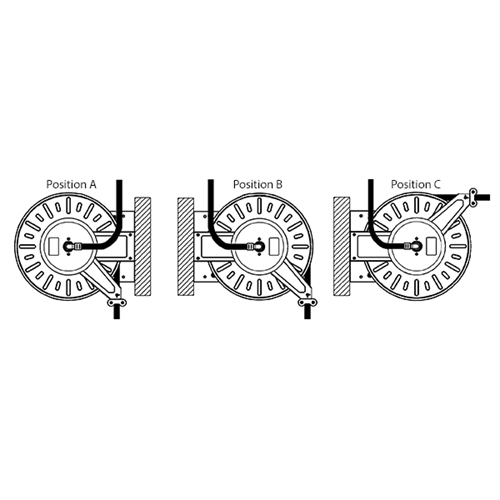Slangstyrarmarna är justerbara i tre olika lägen enligt till slangupprullningsinstallationen (pos. A-B-C).