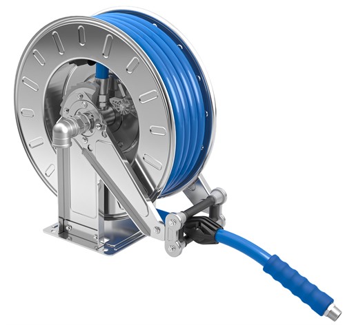 Automatisk slangupprullare avsedd för tvättoperationer med vatten och diskmedel vid olika tryck- och temperaturförhållanden.