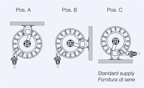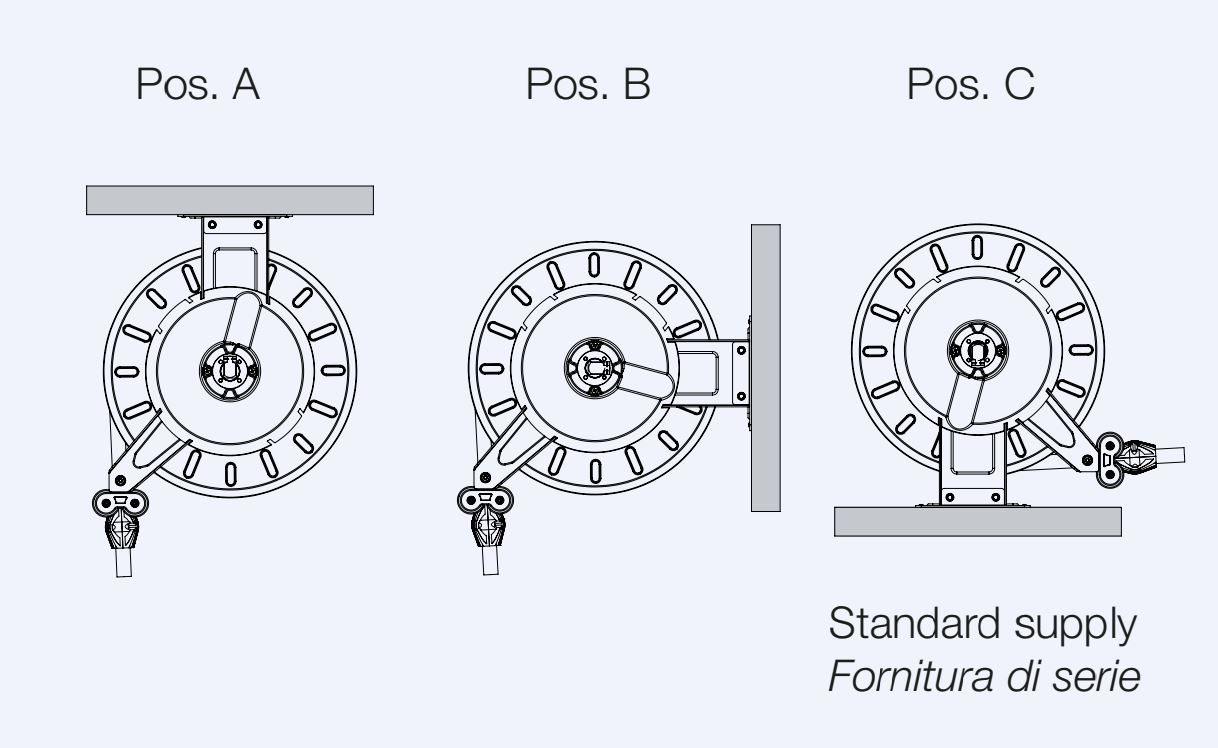 Slangstyrarmarna är justerbara i tre olika lägen enligt till slangupprullningsinstallationen (pos. A-B-C).